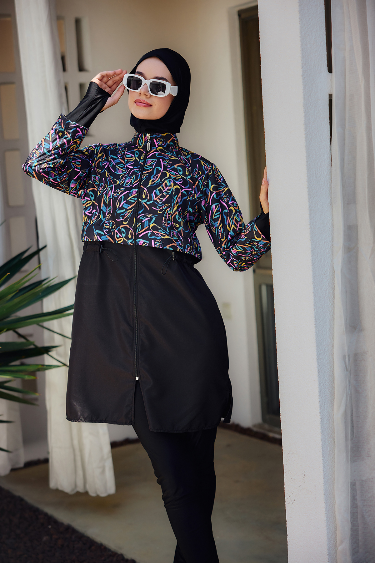 Night Garden is for those “sun is up, plans are spontaneous” days—when you want full coverage, a polished look, and a set that feels easy from the first step outside. This zip-front burkini set pairs a deep black base with a lively, leaf-like print on the upper body and sleeves, giving you a clean silhouette with just the right amount of color and movement.