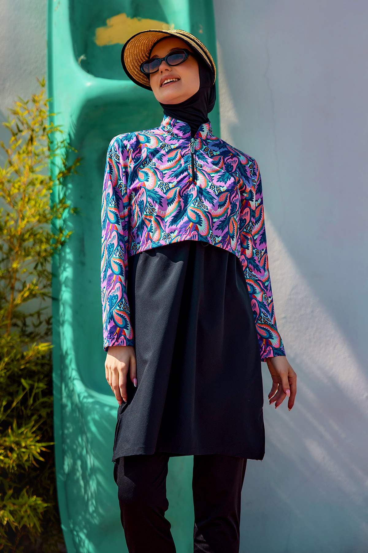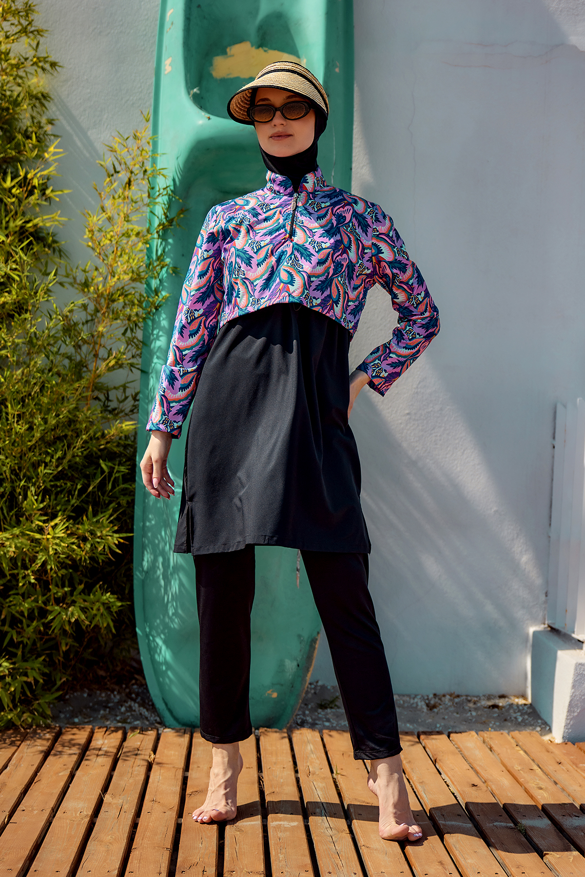 Orlina burkini set with vivid swirl-print top, black flowy tunic and leggings plus cap. Smooth stretch comfort that dries fast for pool and sea days.