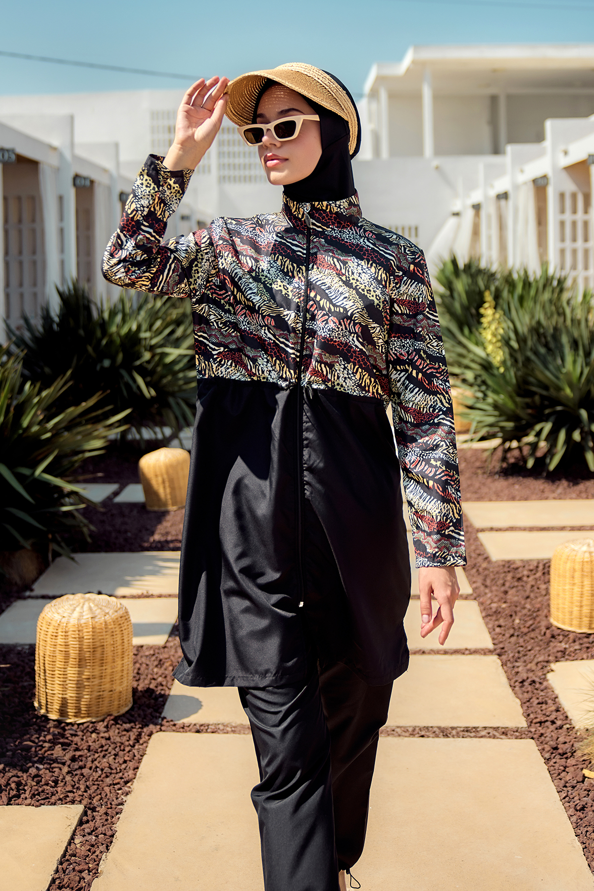 Ravena is for the days you want full coverage with a little attitude in the print—easy to wear, easy to move in, and definitely not boring. This 3-piece modest swim set includes a long-sleeve tunic, matching swim leggings, and a coordinating swim cap, so you step out looking finished in one go.