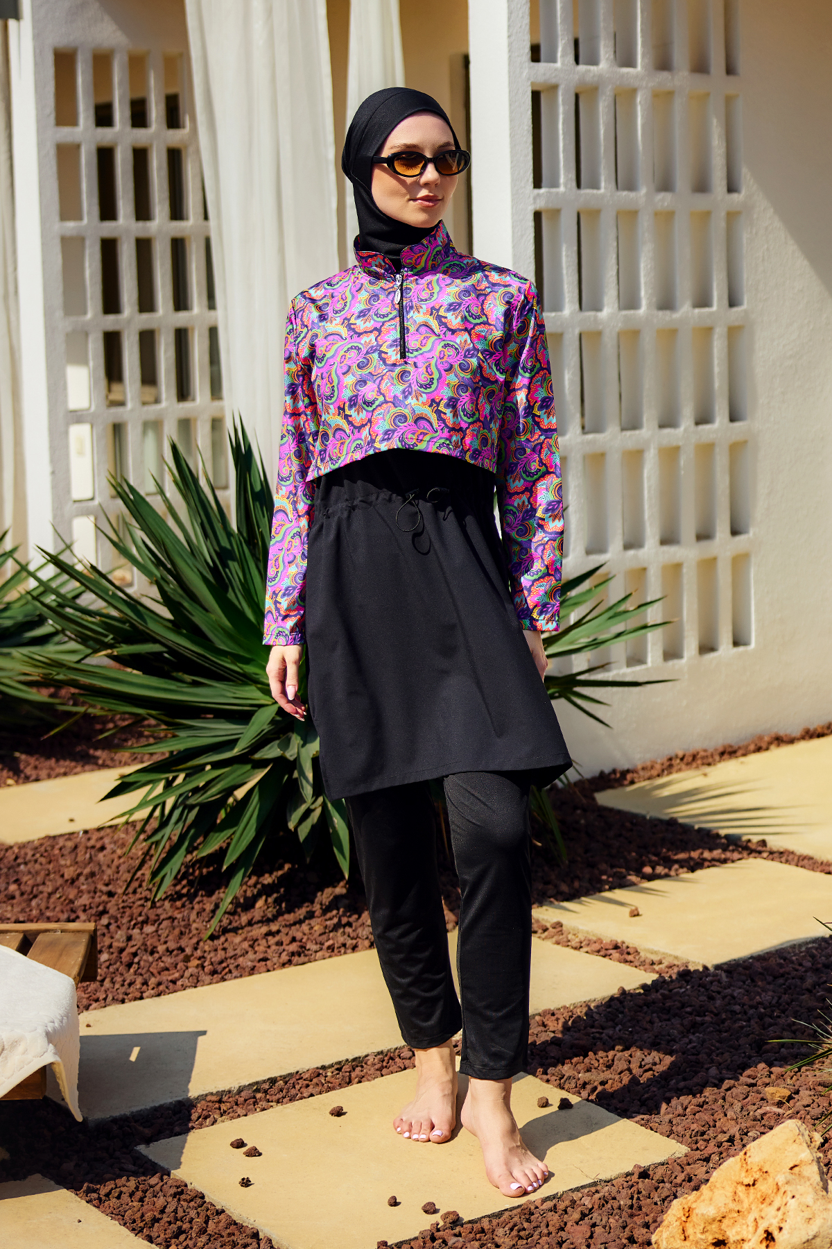 The tunic features a high neckline and a smooth front zipper, making it super practical on real swim days. If you’ve ever tried changing when your outfit is slightly damp, you already know why this detail matters. Zip it fully for a neat, secure feel, or lower it a little when you’re cooling down after a dip. The upper part and sleeves are covered in a lively paisley print with bold pinks, greens, and blues—while the lower panel stays sleek in black, keeping the whole look balanced and easy to wear.